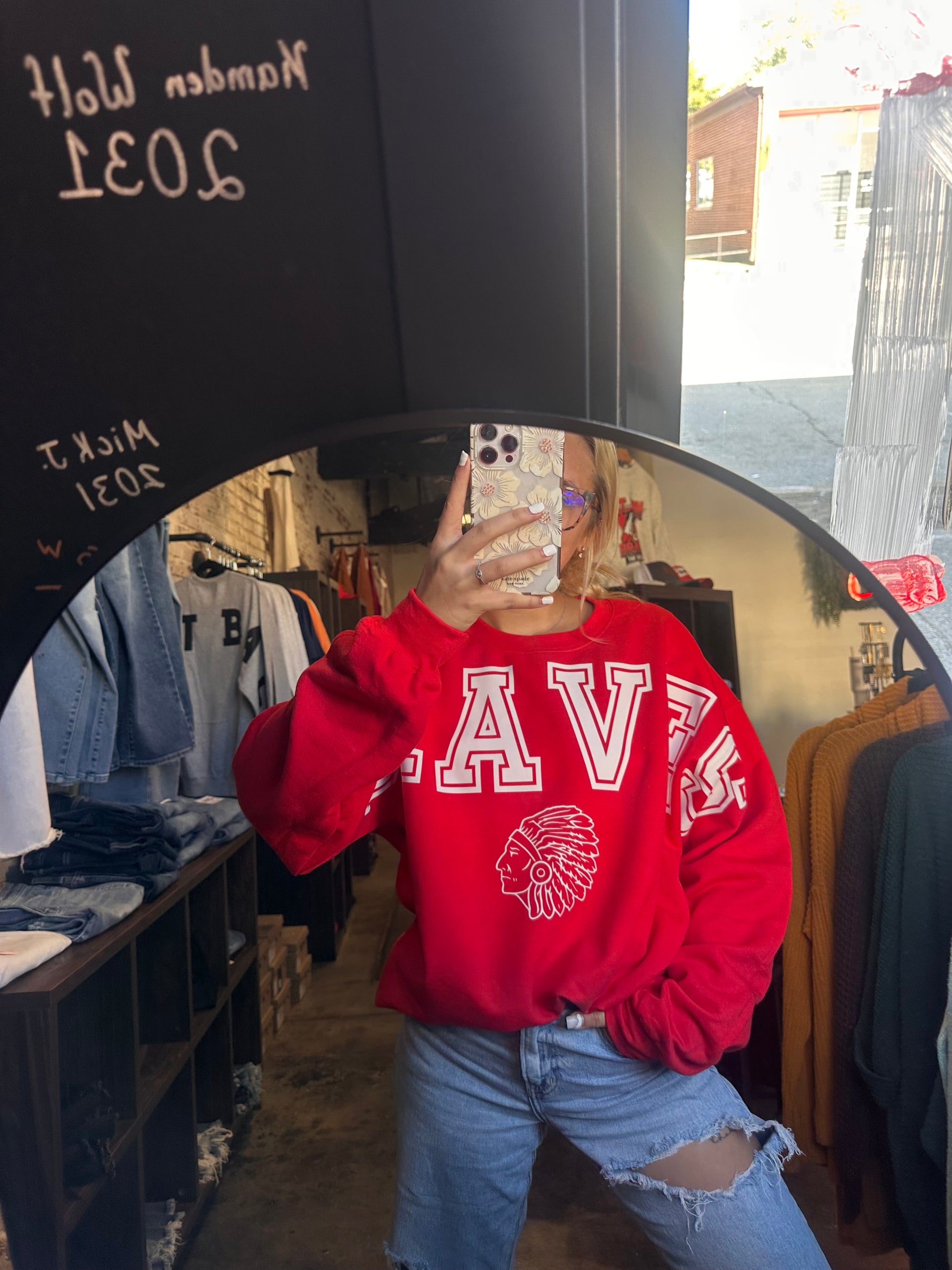 This red sweatshirt features a bold white design that can be placed on the front or back, giving you versatile style options.