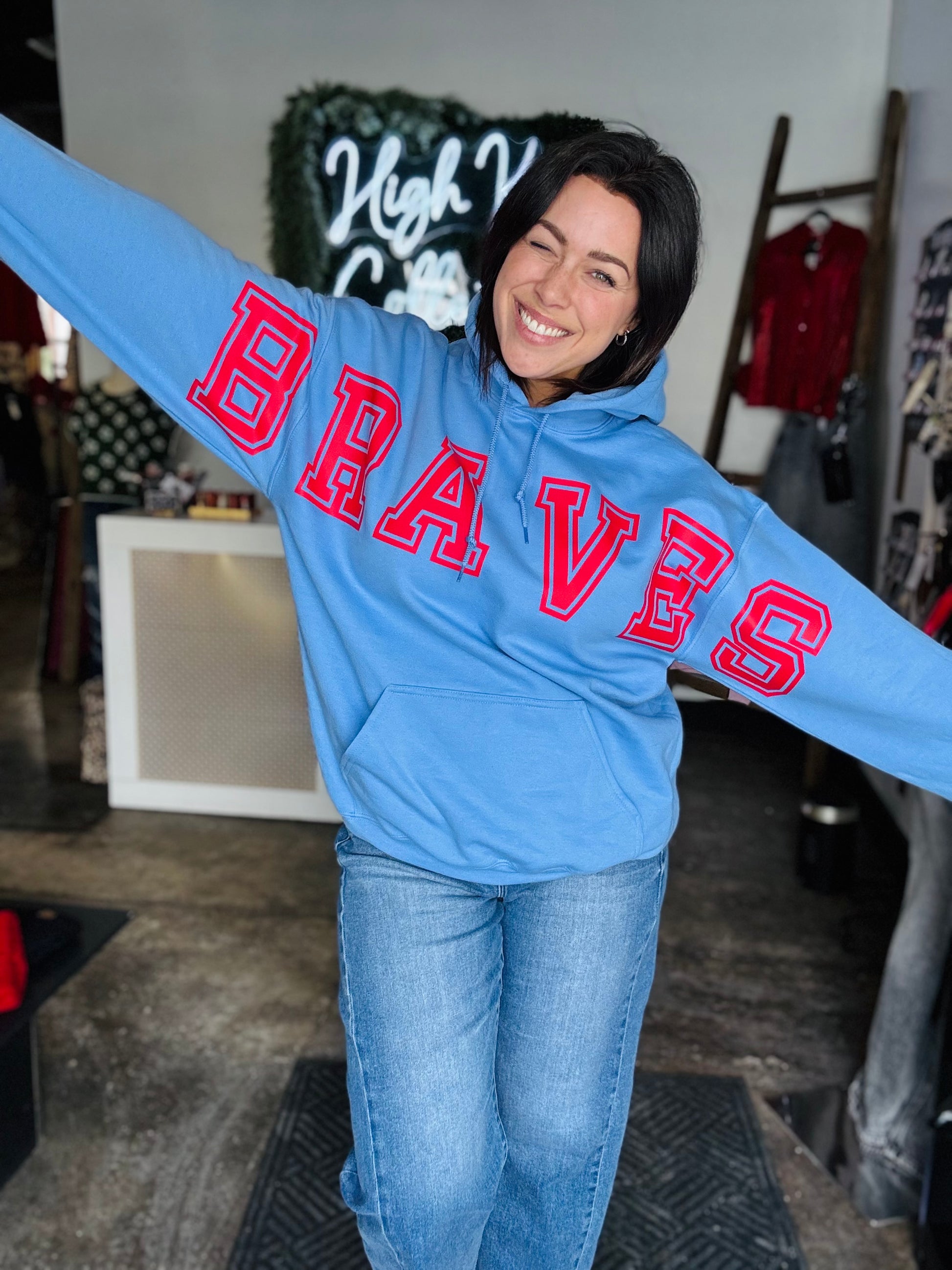 A spin on our Braves Big Spirit — we decided to put this on Carolina blue with our vibrant red that almost gives glowing vibes!