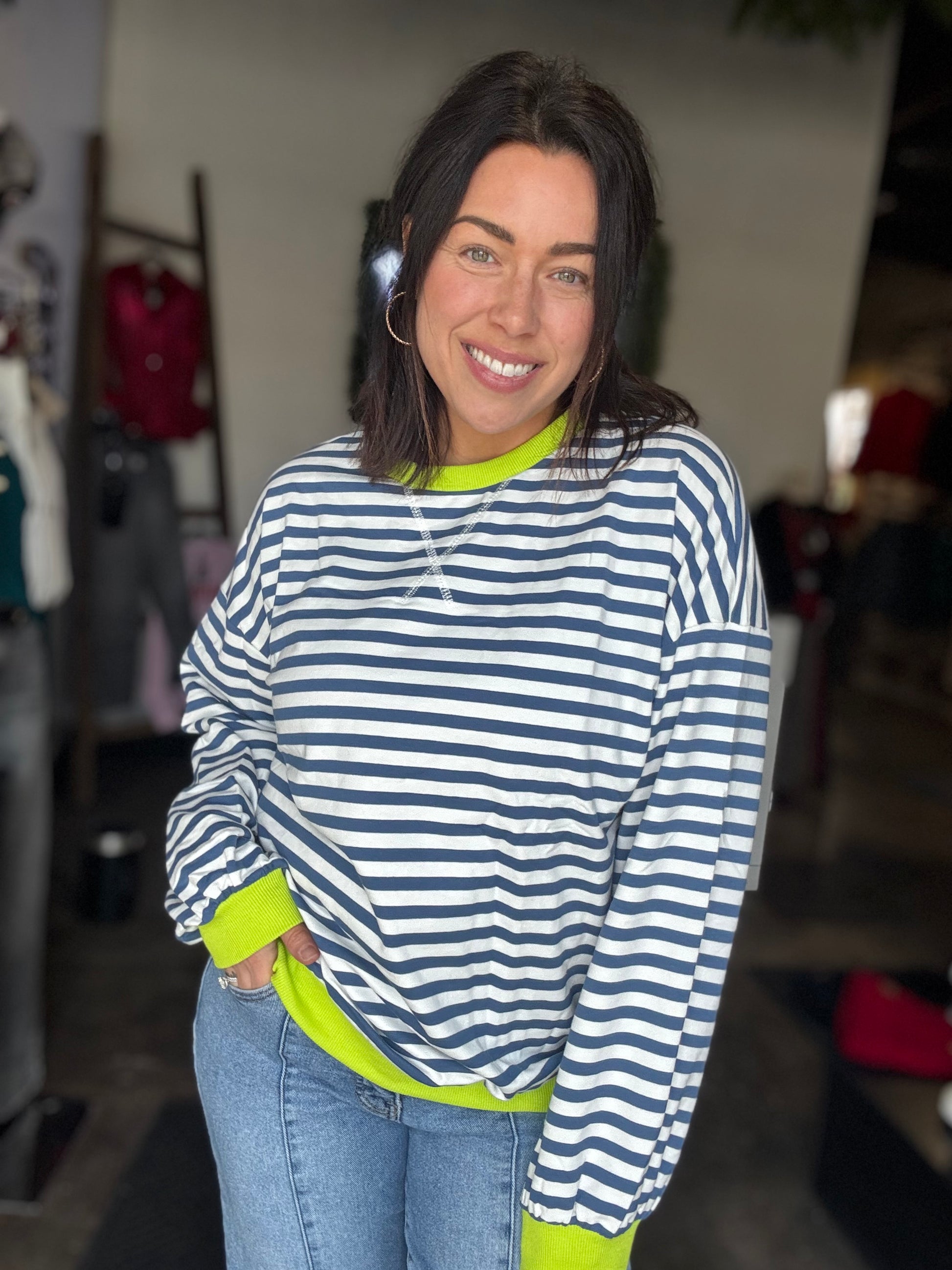 This long sleeve top features classic navy and white stripes with a fun pop of lime green at the hem and wristbands. Made from 100% rayon, it’s lightweight, soft, and easy to wear. Designed with a relaxed drop shoulder and an oversized fit for that effortless, laid-back look. Heather is wearing a medium.