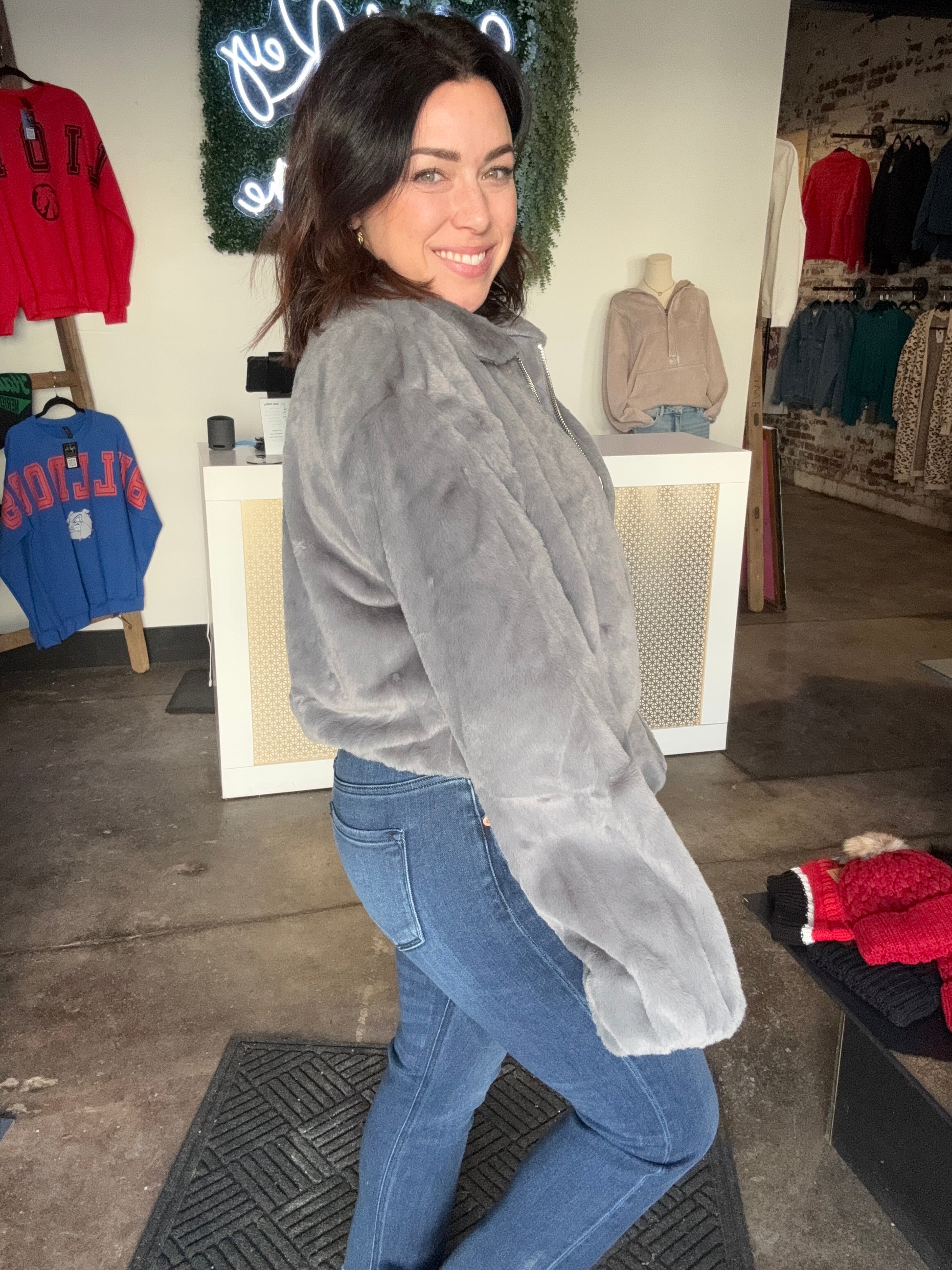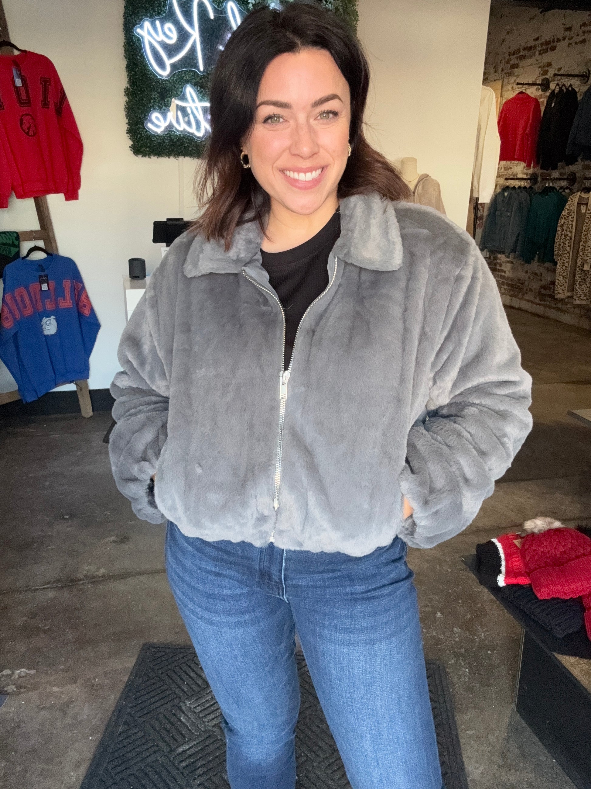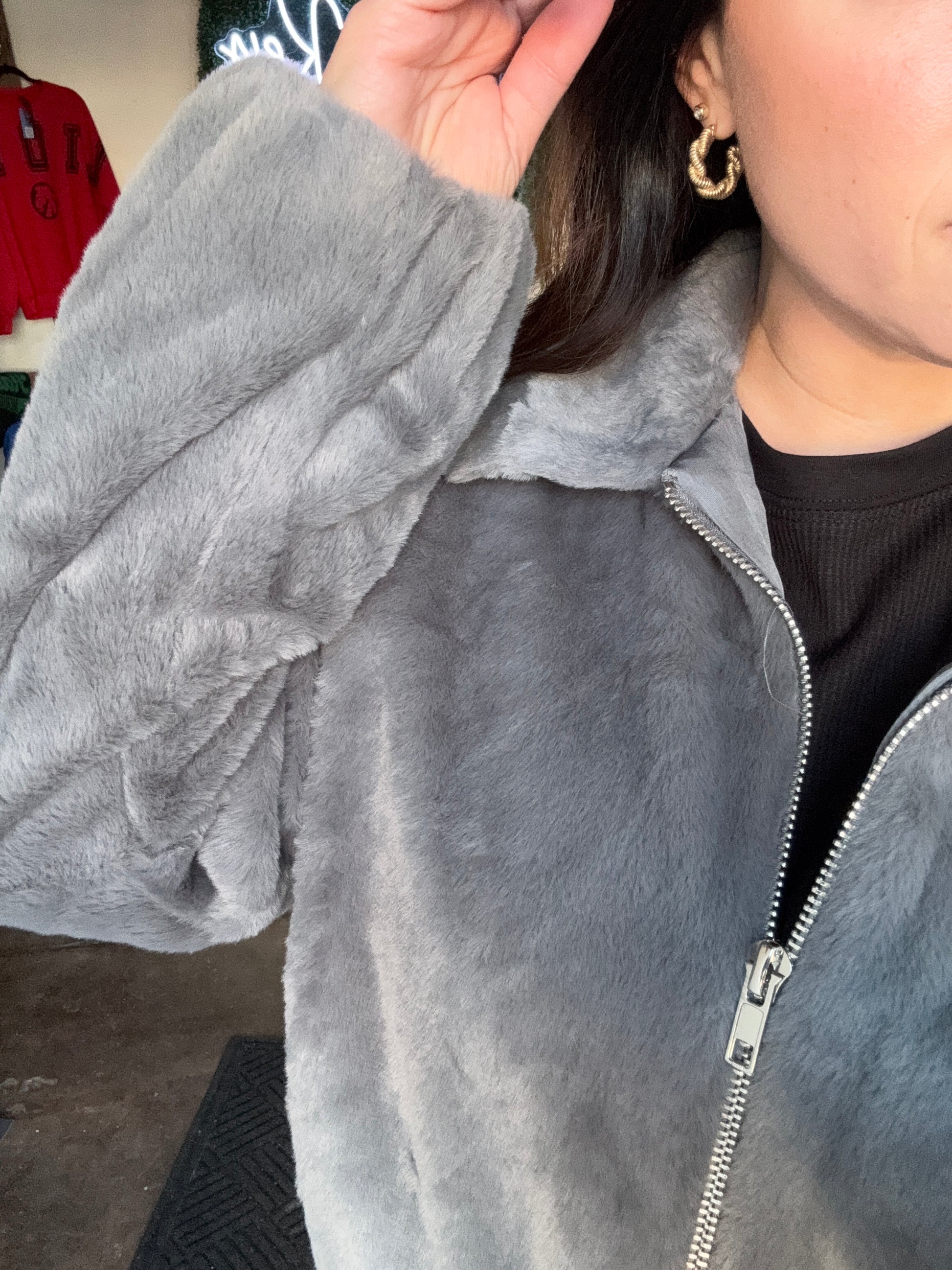This gray faux fur zip-up jacket is everything — insanely soft, perfectly fuzzy, and designed with a plush collar, pockets, elastic waistband, and elastic wrists. The semi-cropped length hits right at the waist for a flattering, on-trend fit. Runs true to size! Heather is in a medium.