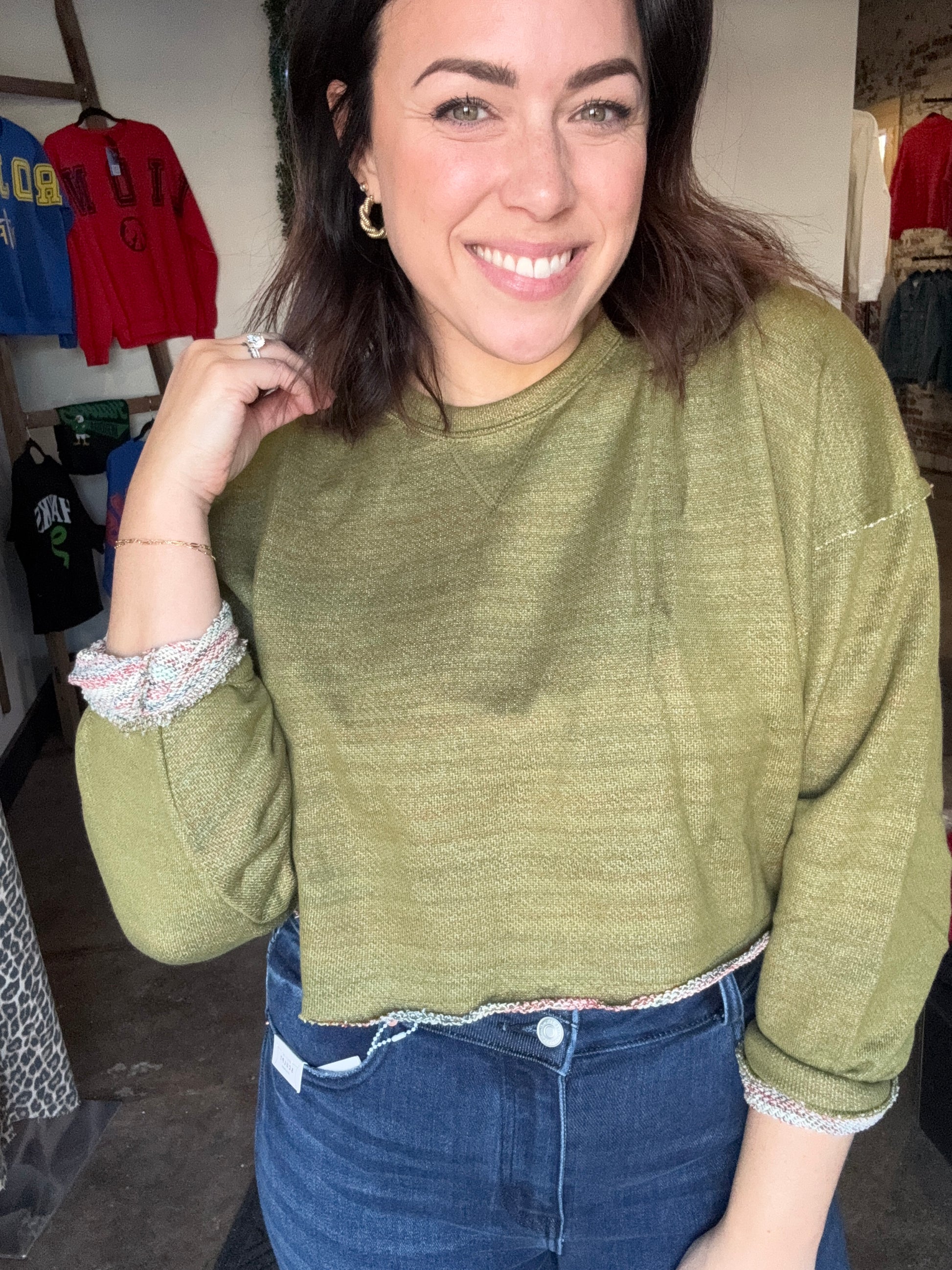 This effortless cropped top blends comfort with elevated style. Designed with a classic crew neckline, relaxed-fit bodice, and long loose sleeves, it features drop shoulders for an easy, laid-back vibe. The cropped hem finishes the look perfectly for pairing with high-waisted denim or layering pieces. A standout detail you’ll love: the inside showcases a beautiful multicolor lining that peeks through when you roll the sleeves for a fun pop of personality.