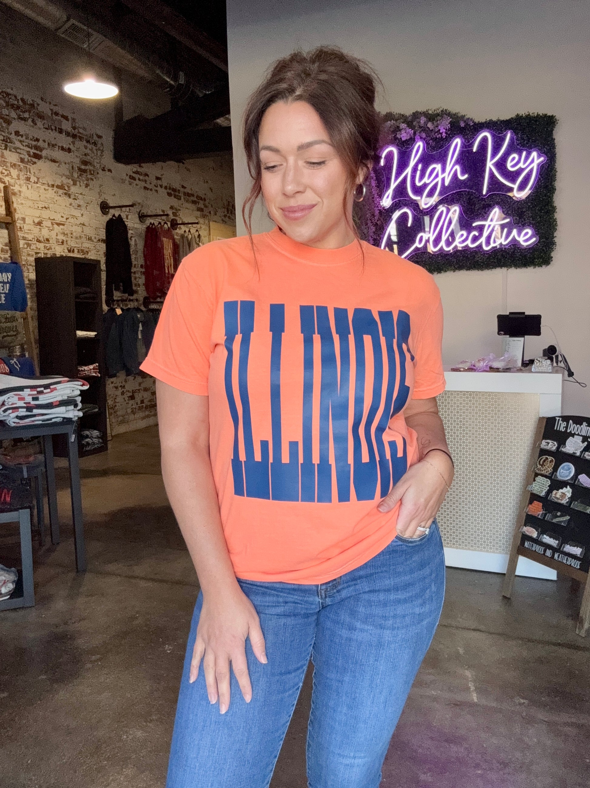 Unique yet fun twist on orange and blue. This melon colored cotton T-shirt features this stretch font in Illinois! But get this… You can get creative with it and put your choice of mascot name in place of Illinois!